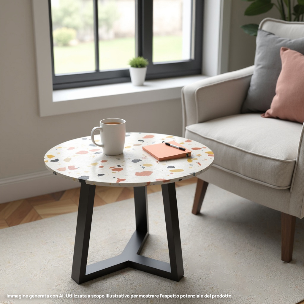Il piano è circolare, con diametro 65 cm e spessore 2 cm, realizzato in marmo cemento, resistente e materico. Ideale per ambienti creativi, contemporanei o per aggiungere un tocco di colore al living.